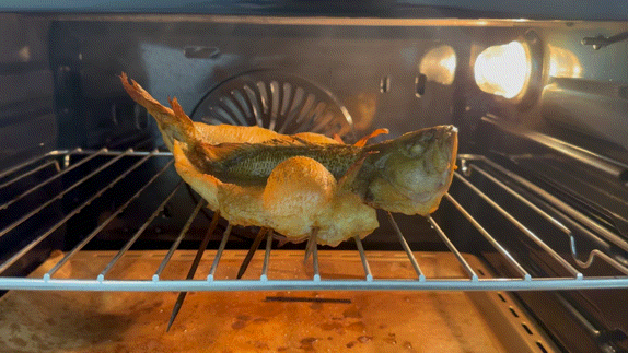 光波红外辐射的穿透力极强,鱼肉熟得很快,同时鱼身上的油脂开始大量流出,鱼皮很快变得金黄焦脆,部分还形成一个小鼓包的样子,十分好玩。