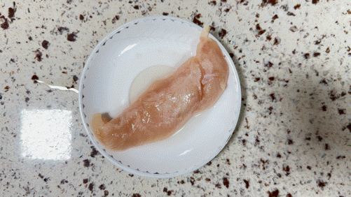 用冻鸡小胸来测试,可以看到,使用化冻功能5min之后,出来的鸡肉状态已经变得十分水嫩,且解冻得很通透的状态。