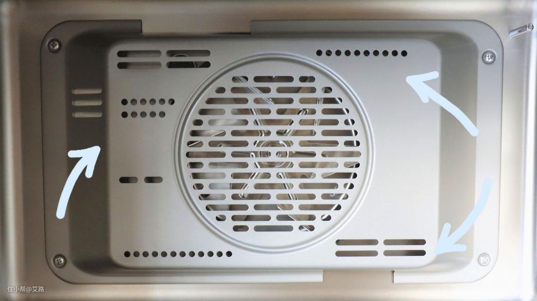 除此之外,还有背后圆圈型的发热管,搭配上大风扇,最快2.5s就可以实现热风充满整个烤箱内腔,无论是烘烤还是空气炸,都可以有快速且高效的表现。