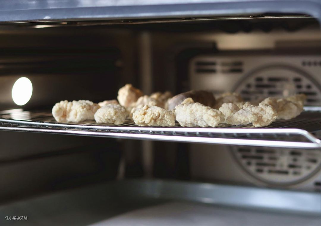 模式选用的是预设菜单【盐酥鸡】模式,这个模式下烤箱会开启风扇使用热风循环工作,来让食材表面快速焦化,并迅速达到脱脂滤油的效果,使得成品在酥脆的同时完全不油腻。