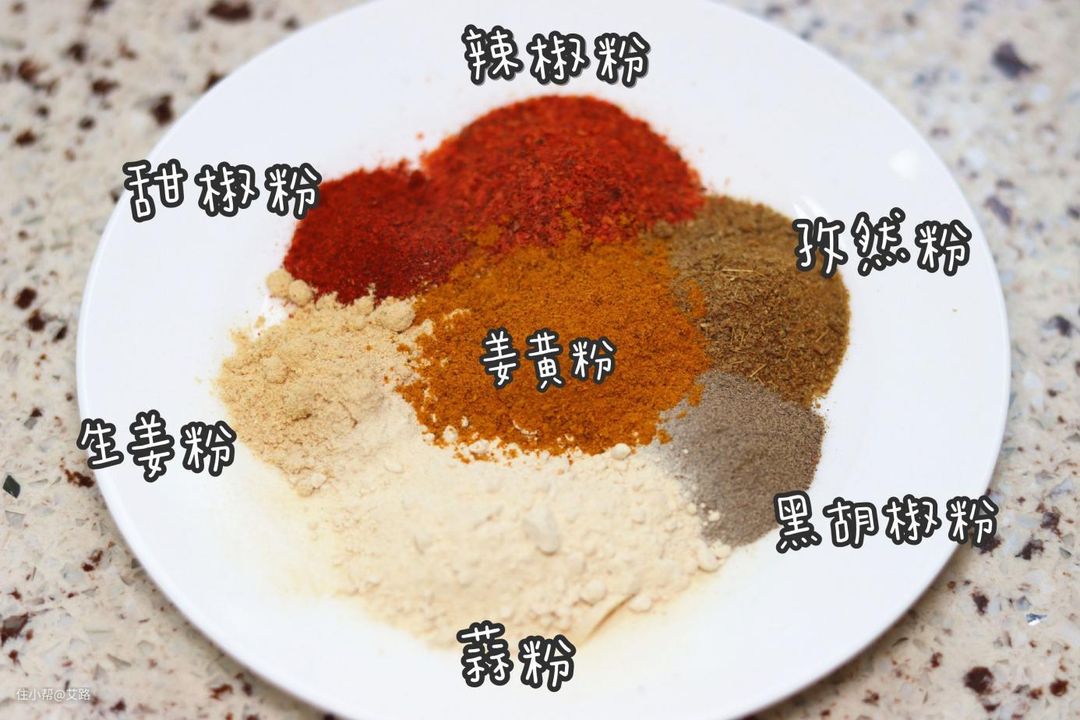 接下来准备以下调味品,包括辣椒粉、增香增色的甜椒粉和姜黄粉、孜然粉、黑胡椒粉、生姜粉和蒜粉。