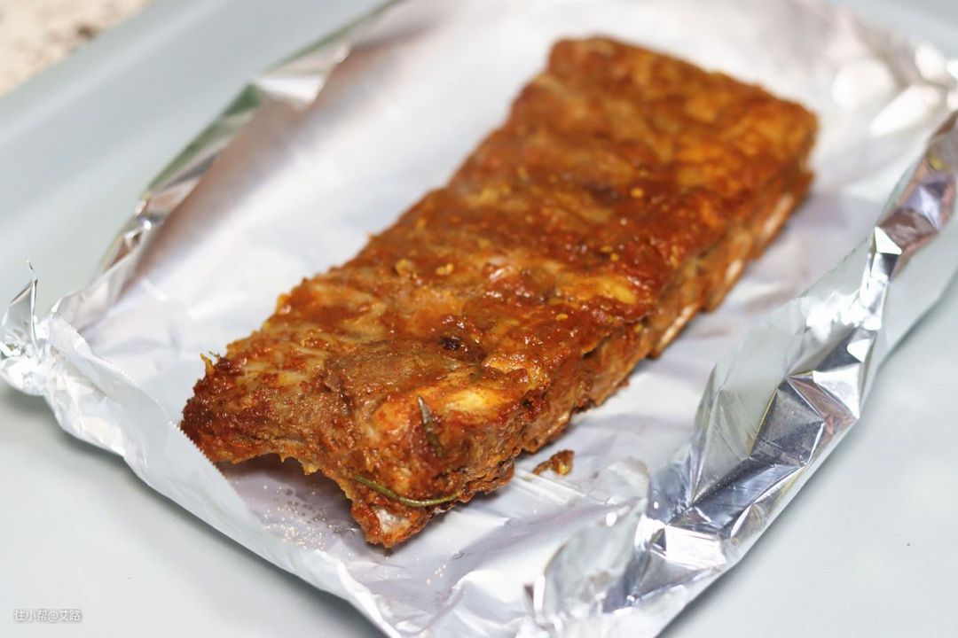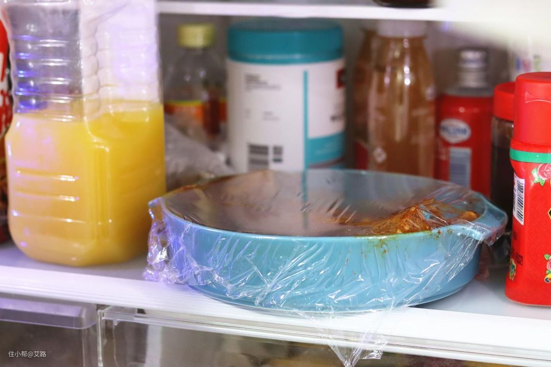 而后将肋排用保鲜膜封好,送入冰箱腌制12小时以上(过夜也可)。