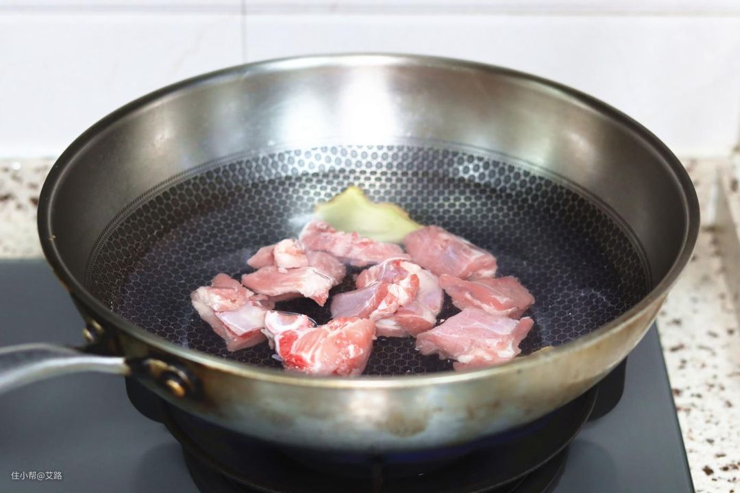 首先汤骨冷水下锅,放入姜片,进行焯水去沫,这一步可以最大程度地保证汤水清澈,让汤喝起来没有猪肉的腥臊味。