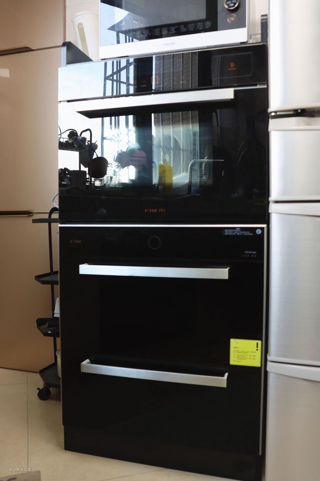ZK-ES5i的造型有十分传统的“方太味”,黑色钢化玻璃面板+银色横杆和我摆放到柜子下方的方太消毒柜有整齐划一的美感。
