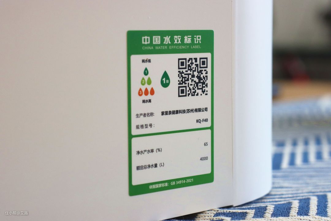 下方则有着显眼的水效标识,可以看到家里泉矿泉机是的水效等级是一级,代表它有着更高等级的净水比,比一般净水器更省水。