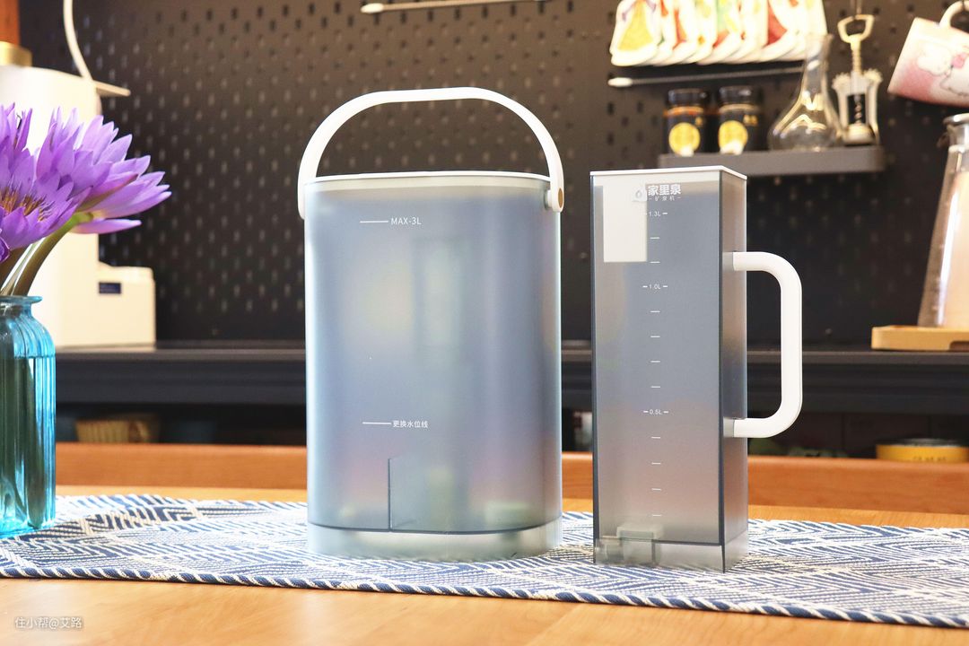 在这次测评之前,艾路接触过不少桌面净饮机,他们的个头普遍不是很大,这意味着储水量也偏小,需要频繁更换水箱。这台家里泉矿泉机有3L的水箱+1.8L的矿泉壶,个头算是比较大的,可以满足2-4人的日常用水。(如果需要更大的,还有5L水箱的Plus款可选)