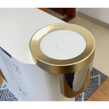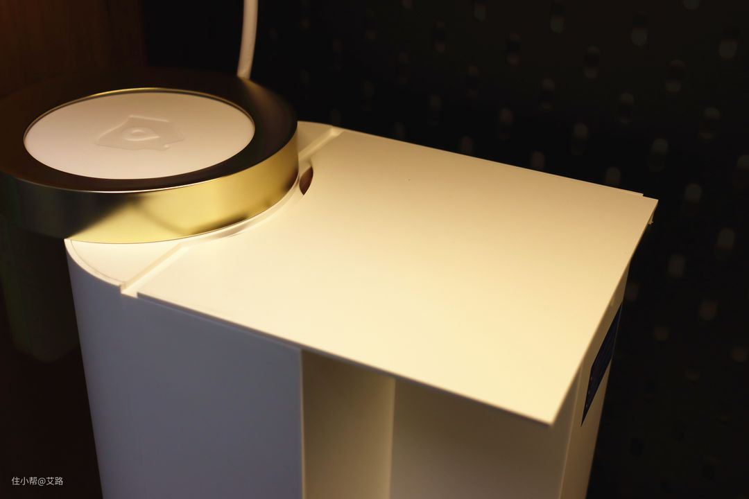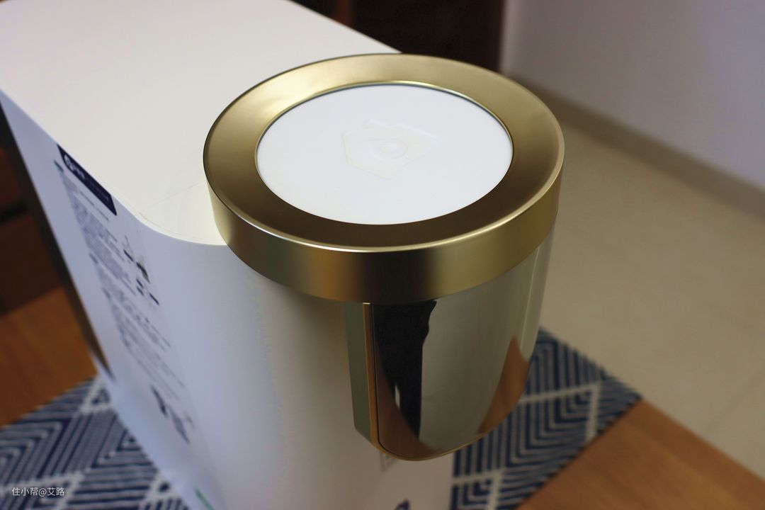 机身上方金色圈圈部分是出水口&触控面板,做成了“7”字型,边侧的金色点缀和白色主机很搭。
