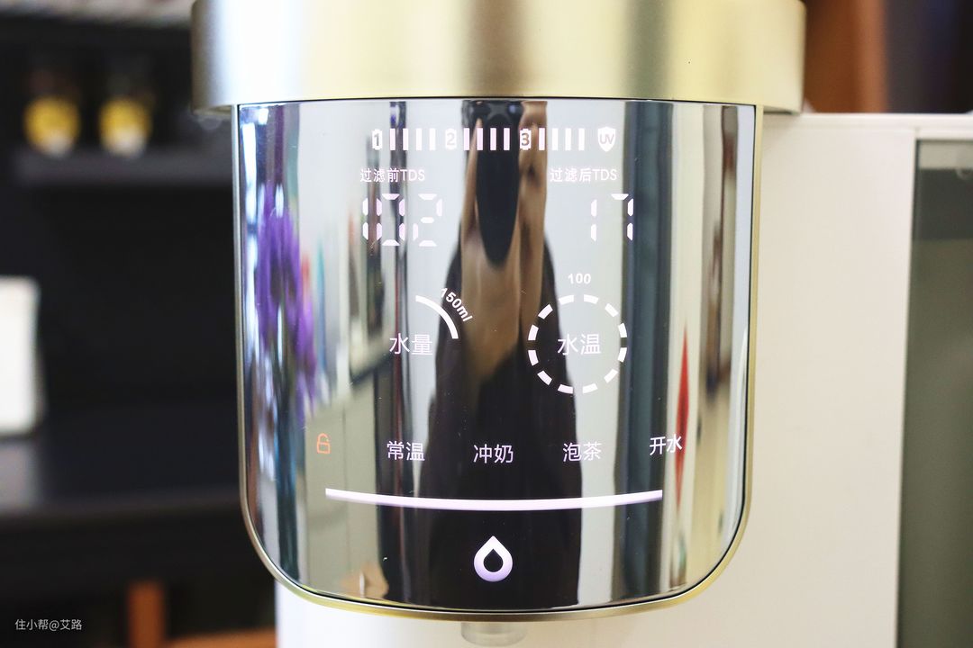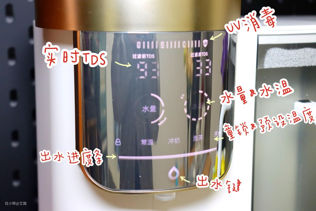 由上至下分别是滤芯的UV杀菌指示,两个水箱的实时TDS指数,可调节的水温&水量,童锁和预设温度(功能)还有最下方水滴样式的出水键。