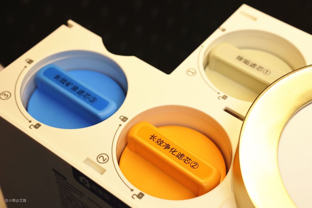 可以看到白黄蓝三个滤芯,每个滤芯上都标有其名称和①②③的数字标识,分别为除垢滤芯、长效净化滤芯和长效矿泉滤芯