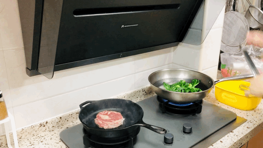 在大火力持续输出的状态下,油烟量激增,而这台米家智能净烟机P1可以能够很好地吸入牛排煎制时产生的油烟。而且艾路还惊喜地发现,煎制过程中“满屋飘香”的Debuff居然神奇地消失了~