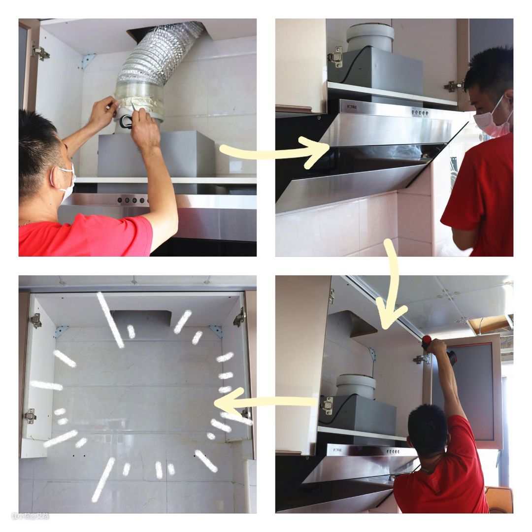 师傅的专业度无需置疑,拆管道,测尺寸,拆柜子,很快便将旧烟机拆卸完成,并腾出了新烟机的空间。