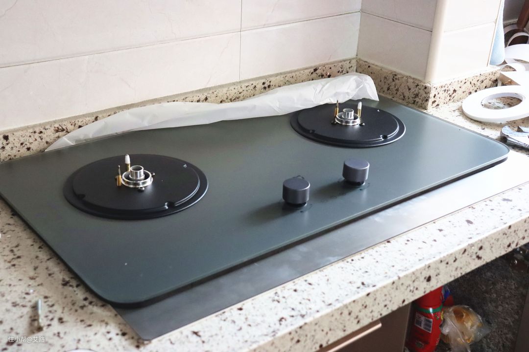接通烟道之后即可开始安装炉灶了。由于我家的开孔偏大,和师傅沟通过后我提前购入了一个燃气灶支架来缩小开孔,确保燃气灶能够顺利安装。