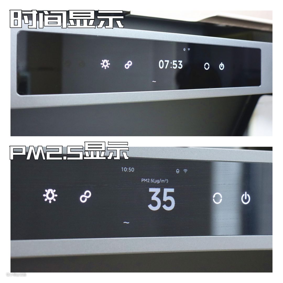 与传统家电的设计思路不同,米家很多家电都加入了触控屏和很多人机交互的设计,操作方式变化的同时,玩起来更有“科技感”。这台烟机配备了一个液晶中控屏,我们可以通过触控来开关烟机、调节档位和控制灯具,同时上面还可以显示时间和PM2.5浓度(需要在米家APP上设置)。