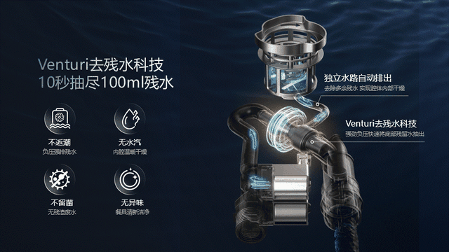 根据官方给出的数据,集成洗碗机XQ20的Venturi去残水科技,在洗涤完成后,10秒钟就可以抽干100ml残水。