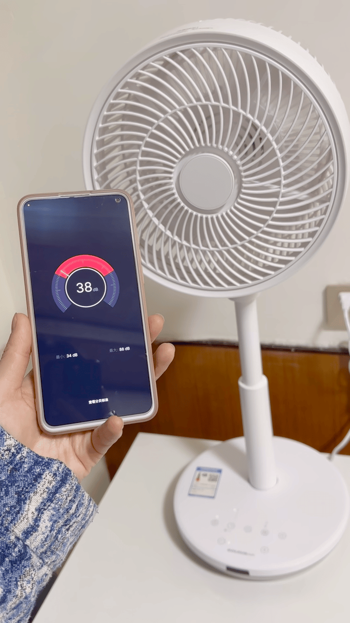 噪音方面我也是非常满意的,它的电机是日本的本美蓓亚电机,出了名的转速快、风距远、噪音小。我以前还在想,风力强劲的循环扇噪音可能会不小。结果用手机自带的分贝仪测了下,开最小档位的噪音只有26分贝,哪怕是最高档也不过才30多分贝。我睡觉习惯把档位调到中间4-5档,够用又不觉得过猛。