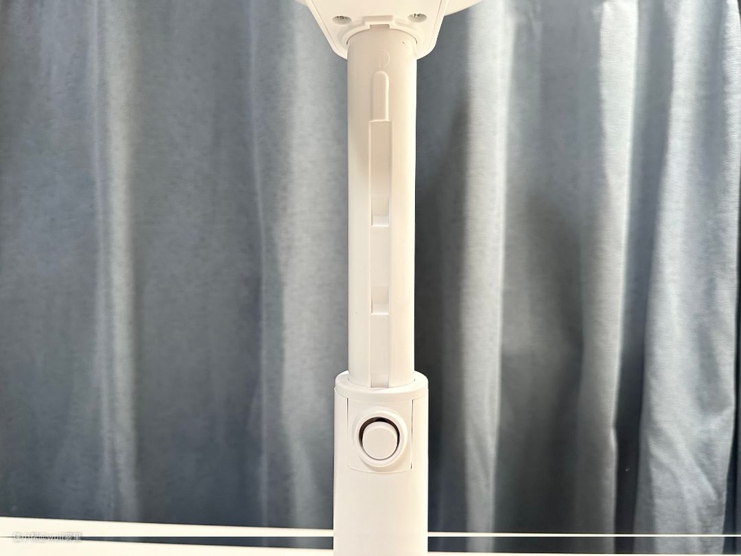 同理,夏天开空调的时候就把它调低一点,下沉的冷空气也更容易被搅动均匀。卡扣调节超简单,单手就能调,按住按钮拔高或压低,听见“咔”的一声就是卡住了,不去手动调节它自己不会变动位置的。