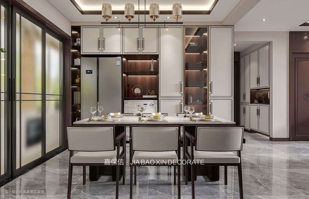 个性橱柜融合了现代与中式的设计,在极大地保证了储物性的同时又保证了风格的一致性,极具美观性。客餐厅一体的设计不仅有扩大视觉空间的效果,也使整个空间更加明净透亮。