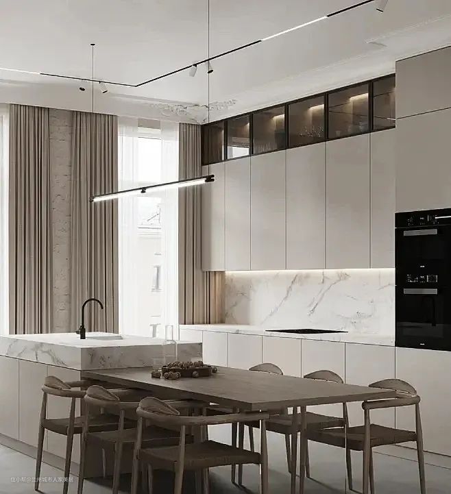 岛台搭配的餐桌长度1.8m , 甚至可以做的更长,最低不要低于1.6米,不能仅仅把ta理解成为一个餐桌,它既可以是餐桌,也可以是学习桌,玩具桌等等,餐桌的宽度90cm,桌板的厚度建议为5cm,若太窄则毫无体量感和质感。
