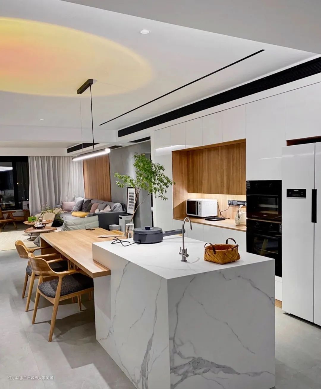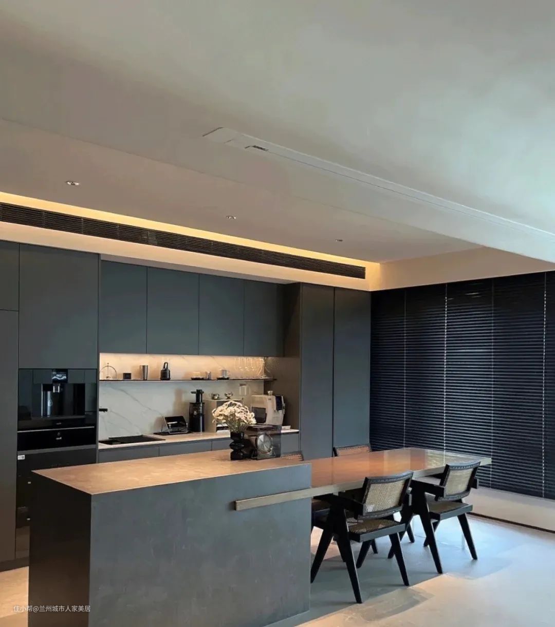 这是当下最受喜爱的设计方式,也是备受追捧种草的网红岛台,岛台与餐桌之间18公分的高差,以及交接处餐桌的侧插处理,形成了空间中强烈的几何符号。