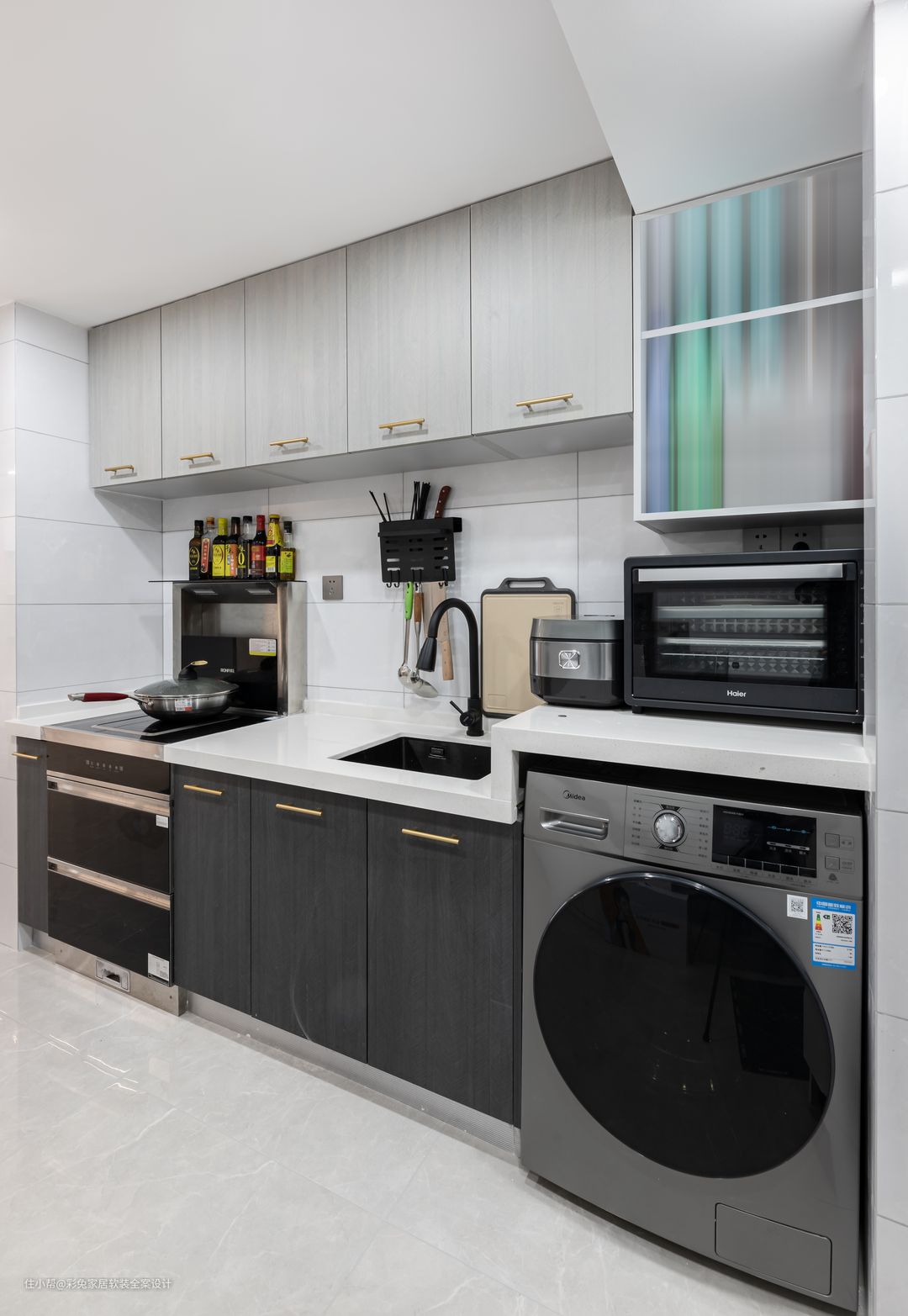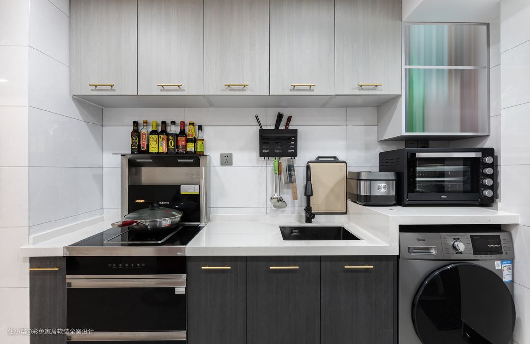 厨房呈开放式设计,橱柜中嵌入电磁炉集成灶、洗衣机,让独居的生活也处处充满精致的质感。厨房墙面空间也得到充分的利用,吊柜加上开放格,把杂物收纳起来,让备餐操作更加顺手更加高效。