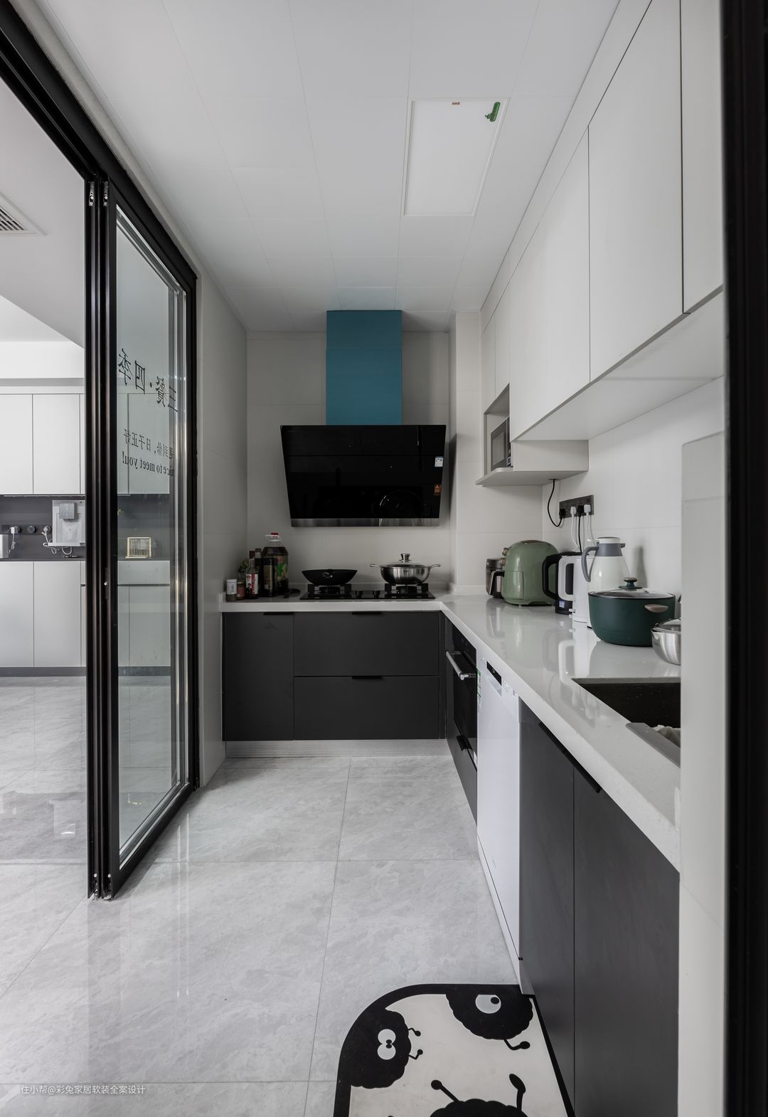 厨房呈L型设计,厨房和客餐厅之间用细边框玻璃门相隔,地面和客厅一体,通铺800*800mm大地砖,拉开玻璃门厨房空间变得更加通透宽敞。