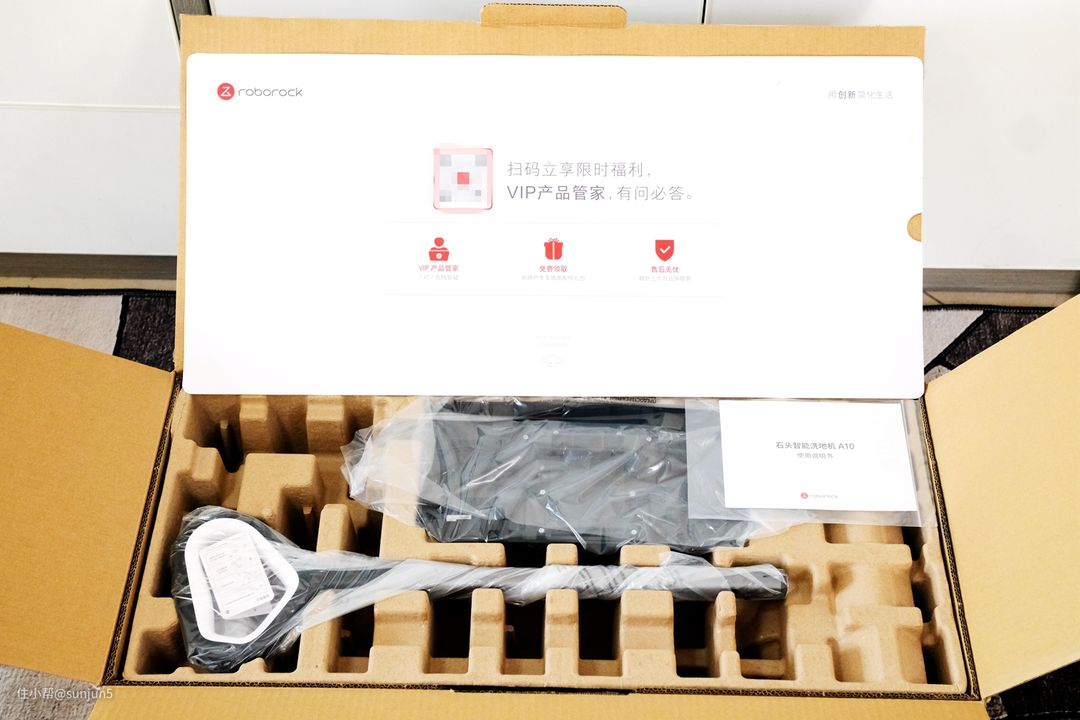 从不大的箱子里取出了“一大堆”东西。全家福:主机、手柄、烘干充电座、备用的滤芯和滚刷以及清洁液和清洁毛刷。
