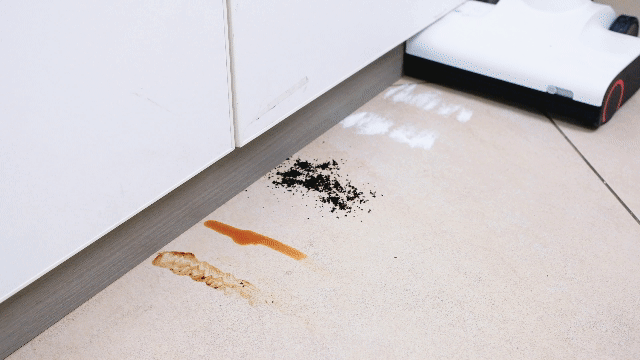 厨房地面清洁起来总是最麻烦的,各种调料、酱料不小心洒在地面上是“家常便饭”,对于这样的重量级污渍,A10的单滚刷也毫不畏惧,一样高效清除干净。