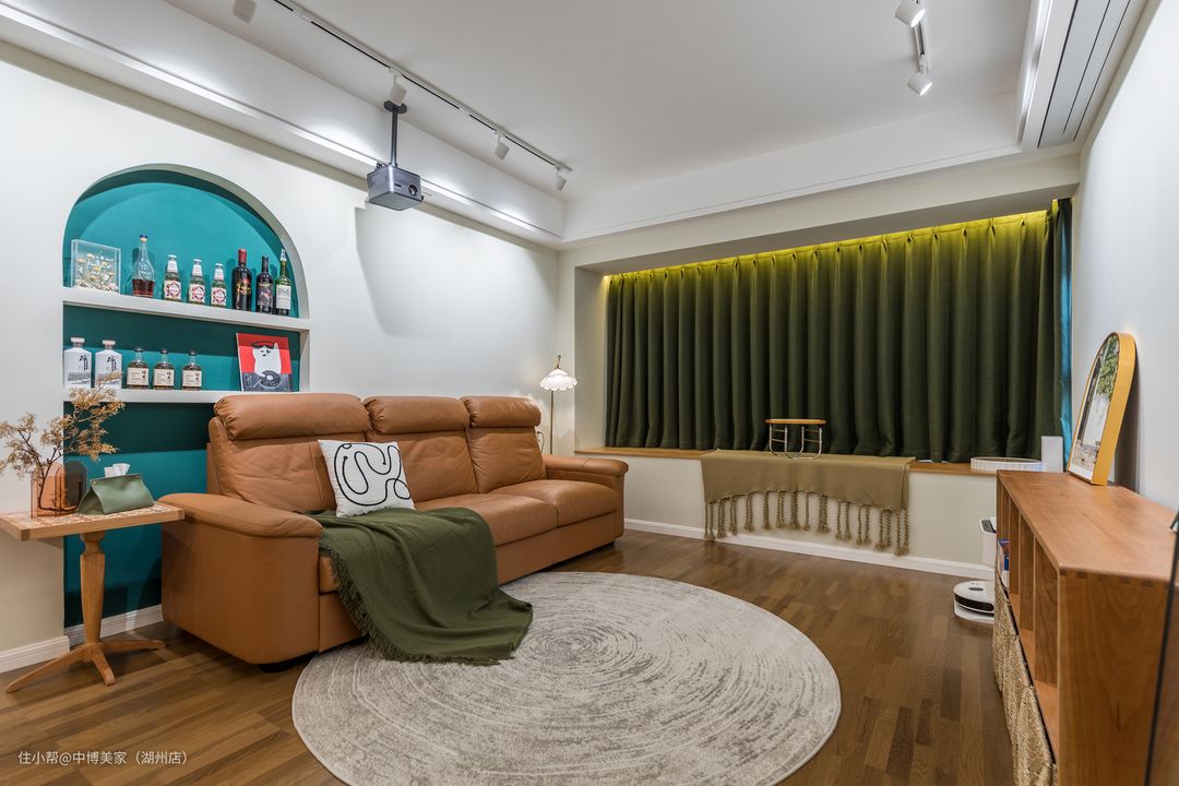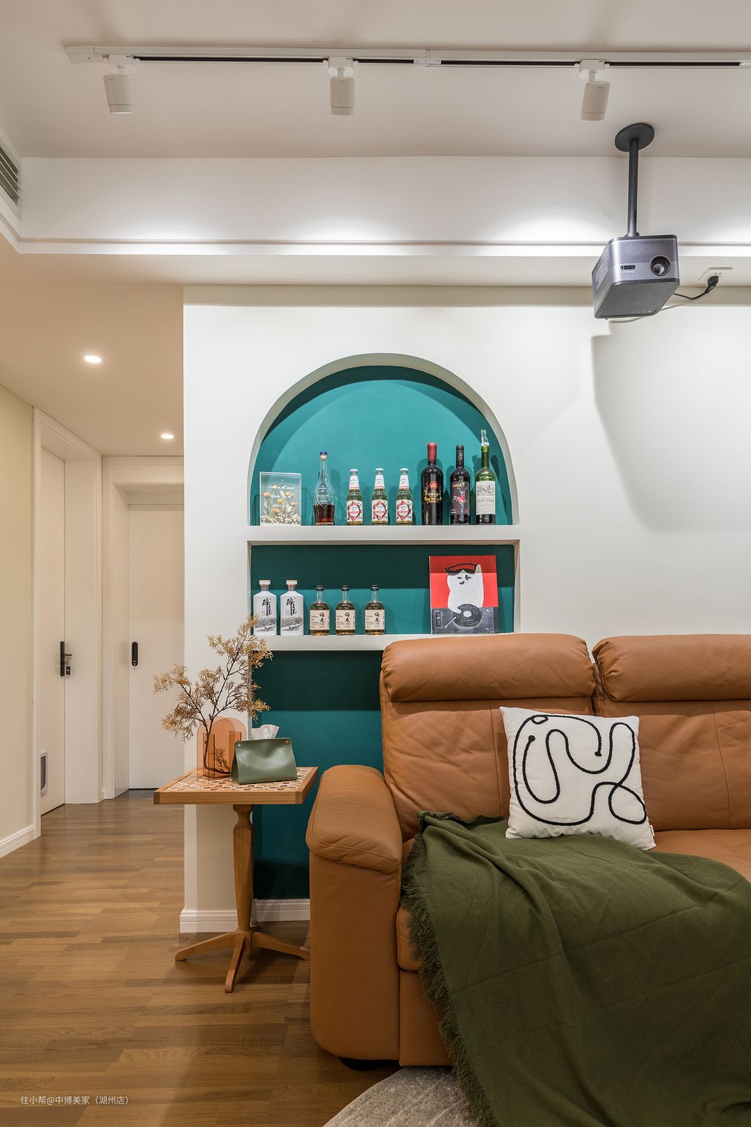 本案是现代混搭北欧风,客厅整体采用米白色的墙顶面,为避免单调,底部温润的木质地板增添了一份文艺气息。沙发背后的小壁龛,设计师巧妙地利用了板墙的距离,放下屋主偶尔小酌的小酒,将功能性和实用主义发挥的恰到好处。
