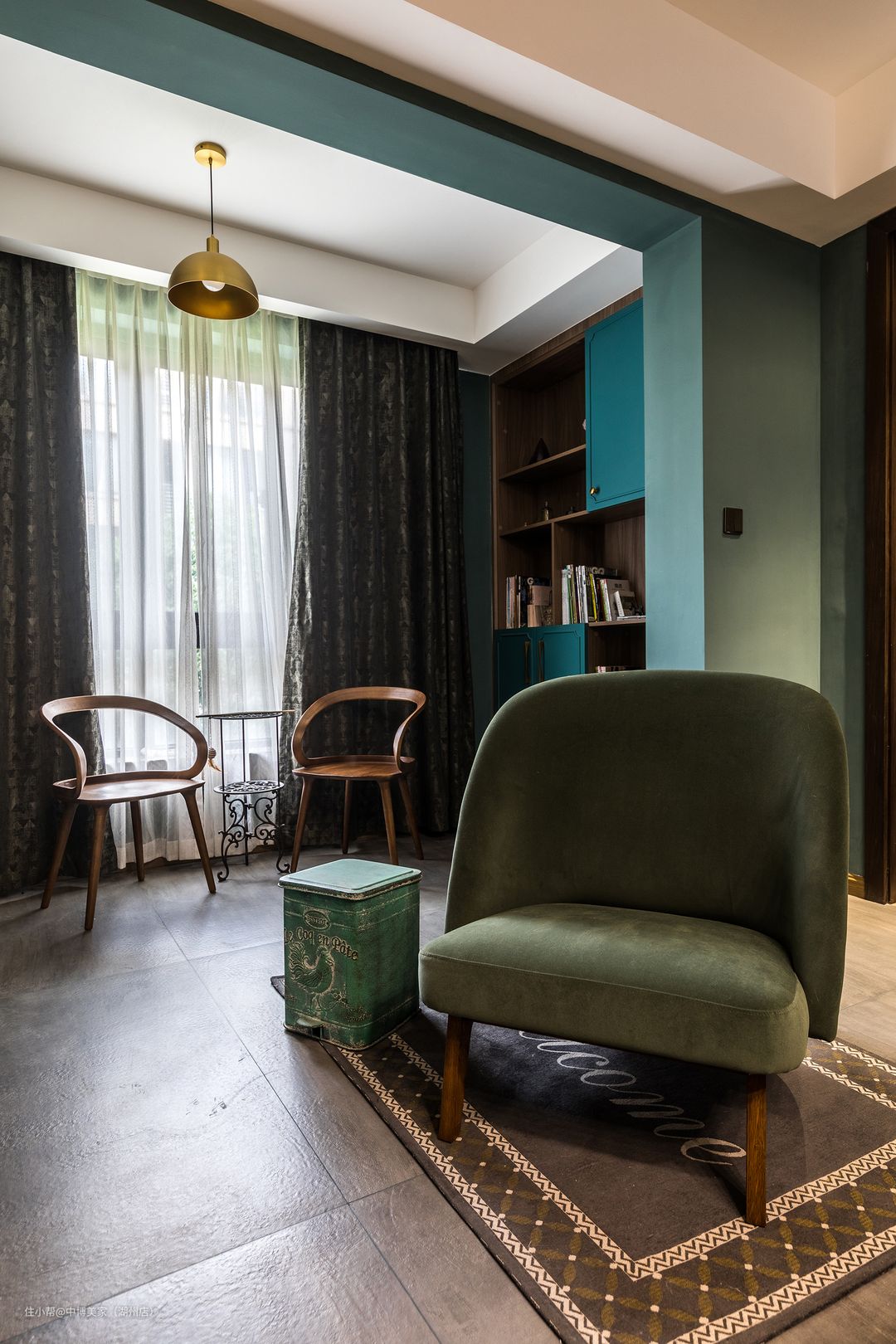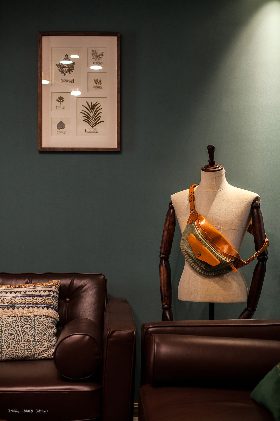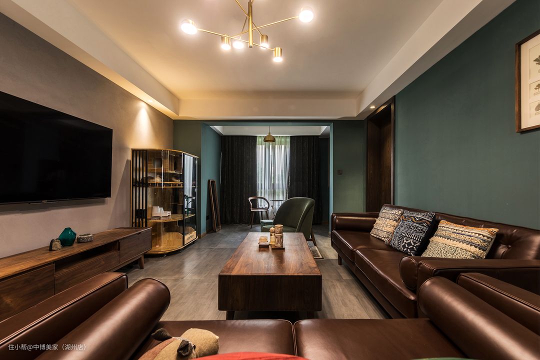 深棕色皮质沙发与绿色单人椅相结合,复古感一整个拉满!再配上绿色、橙色和复古纹的抱枕,不同颜色的搭配很好的提亮整体客厅的色调。沙发墙墙身刷成复古绿的乳胶漆,挂上一幅绿植的竖幅装饰画以及老式木头装饰框。