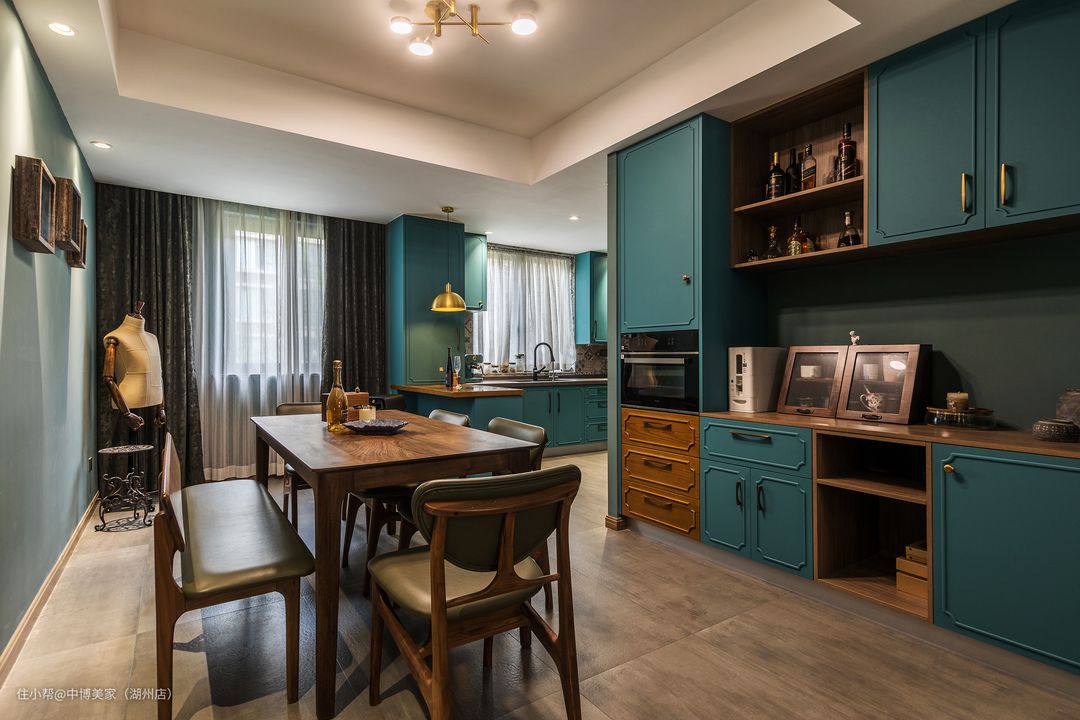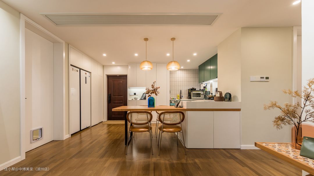餐厅位于进门左手边,屋主对做饭的需求较少,因此设计成开放式餐厨一体设计。餐厅延续了整体风格调性,采用原木餐桌餐桌作为空间视觉重心,南瓜吊灯和筒灯的重叠光影下,让空间蕴藏浓淡有致的复古层次感。