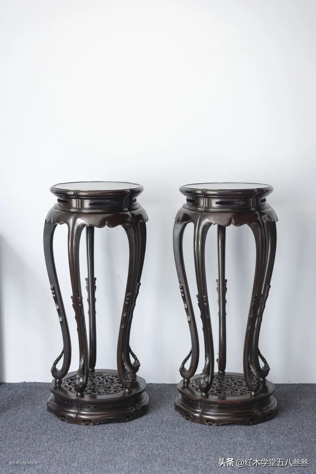 大红酸枝盘三弯腿五足圆香几一对