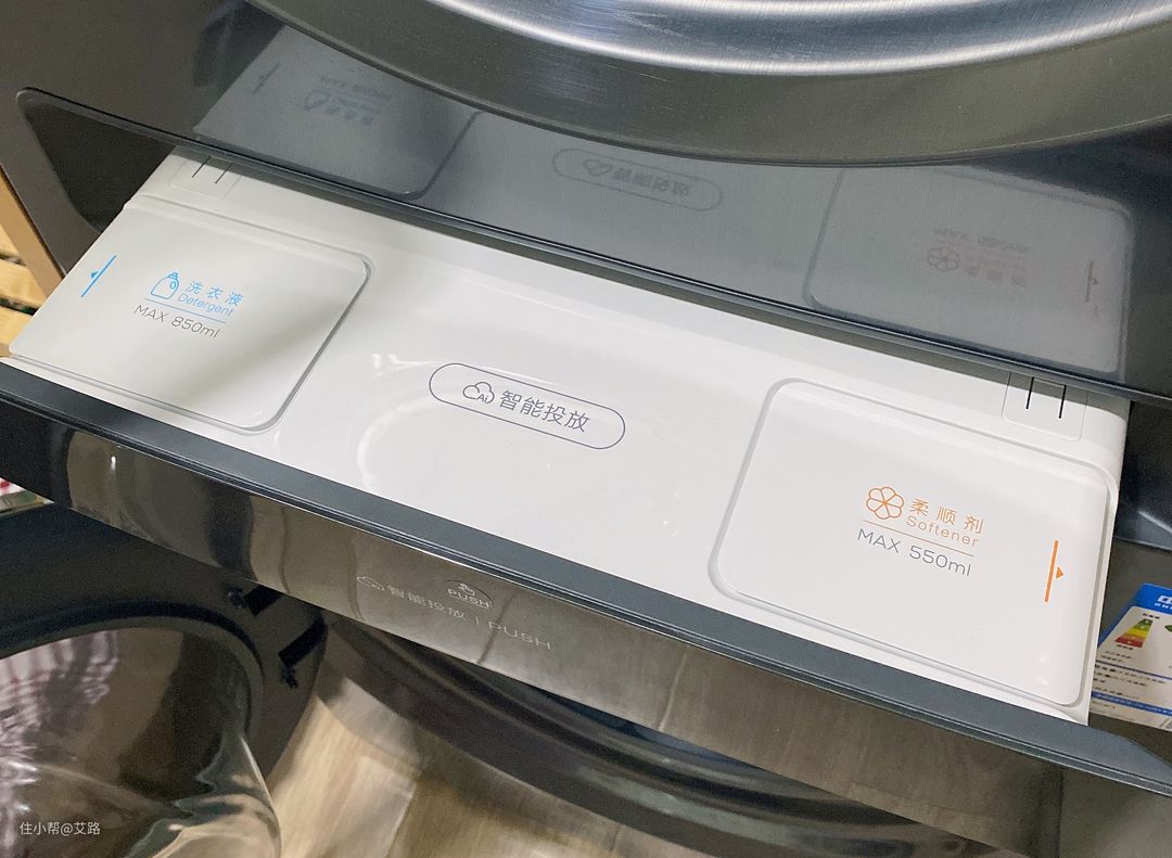 中部的“小抽屉”是各种清洁剂的投放入口,这个高度也是刚刚好的。轻轻按压即可弹出进行投放,一次投放加满可以最多使用30次,十分省心。