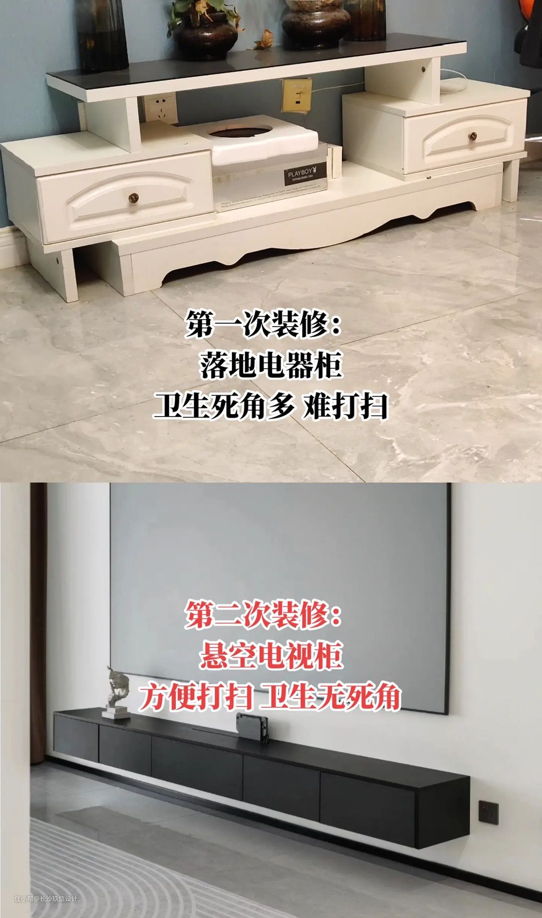 电视柜悬空,无死角,打扫方便。