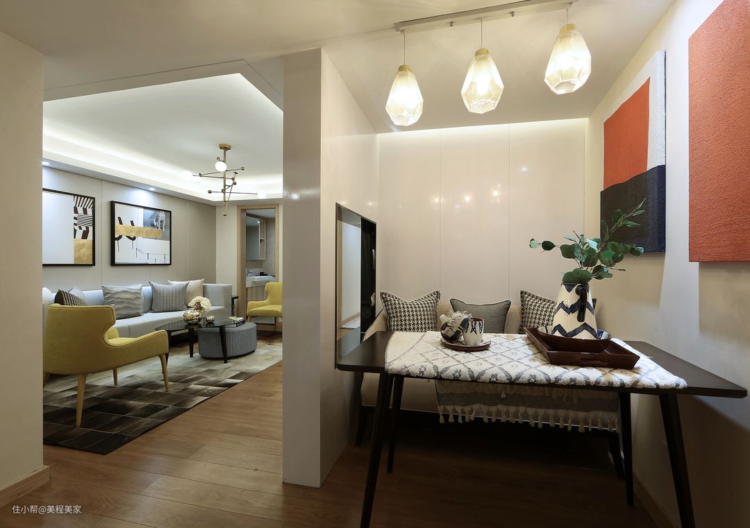 ①玄关柜:进门处的玄关柜,可以说是餐厅中必不可少的收纳工具。 一般来说,玄关柜子的设计深度不低于25 cm,并且要预留出一个可以放置钥匙、雨伞等小物品的地方。对于一些使用频率较高的物品,例如钥匙、钱包等可以选择用抽屉式的收纳,避免因为过多而无处可放。 ②吧台:很多家庭会选择在餐厅摆放一张吧台椅,它不仅是用餐时休闲、聊天、玩手机的好去处,更是美观实用的软装布置。它能给人一种空间层次感,有了它吃饭时就不用一直低着头看手机或盯着电视了。而且吧台还可以作为一个很好的隔断,防止直接对着餐厅影响就餐环境。但要注意吧台和餐桌之间最好留有一定的距离,避免一方过于靠墙造成卫生死角,且不方便使用。