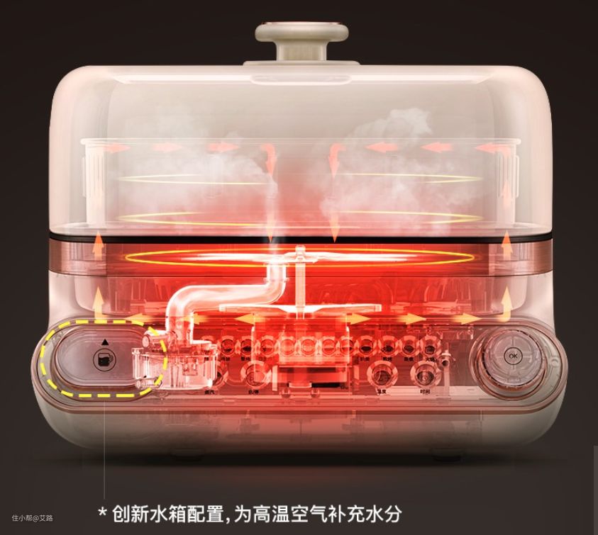 这个功能跟烤箱的“嫩烤”有一点相似。它是将这个水箱里的水进行超声波雾化,形成水雾包裹住食物,再进行热风空气炸,既保证了酥脆又不干巴,外酥里嫩的口感谁不爱呢~