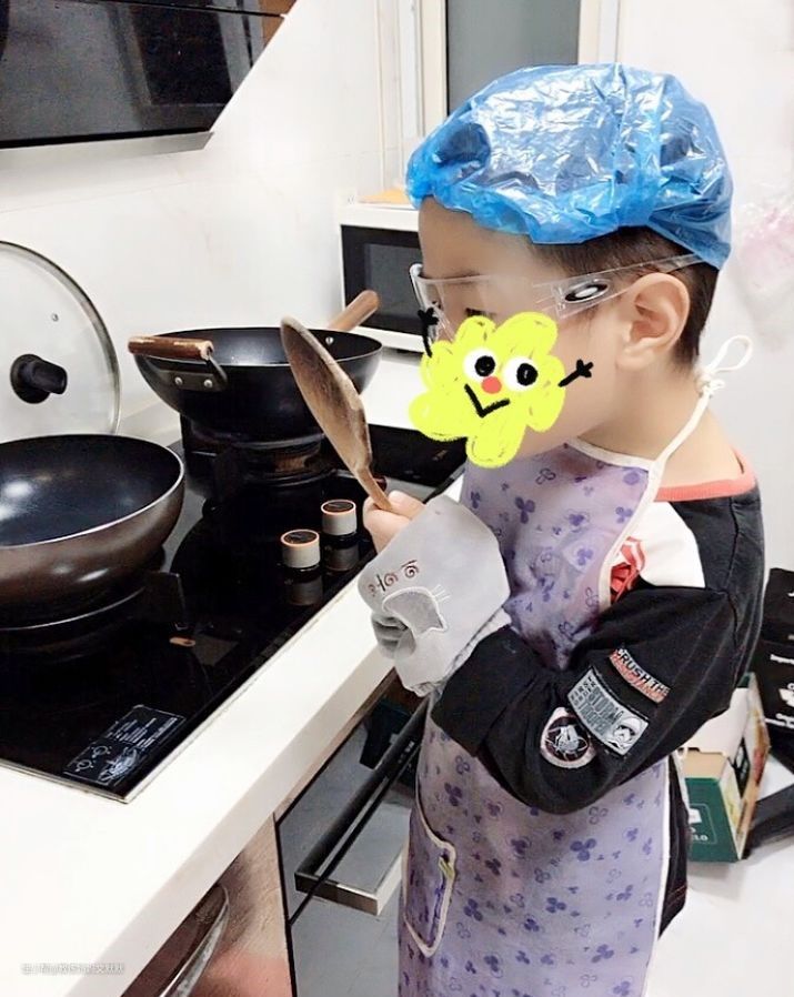 5岁的时候有段时间我自己带他,每天需要从幼儿园接他回来后才能炒菜。那个时间非常紧张,为了防止他一个人“捣乱”,我每天都会邀请他和我一起做饭。小一点的忙会帮我摘菜、洗菜,大一点的我还会教他和面、扯面。难度大的炒菜,我会手把手教他,而且会给他“全副武装”,生怕油溅到他脸上手上。