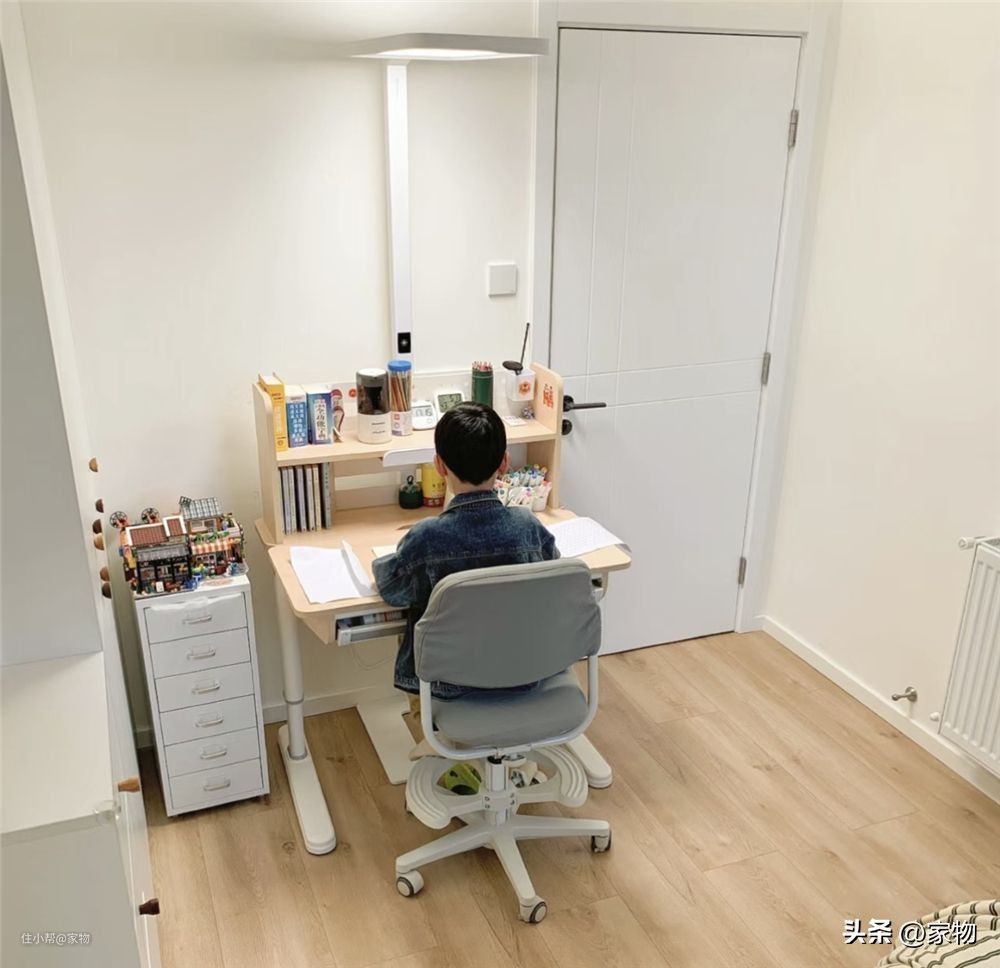 门口的位置放上了一张学习桌,孩子平时就在这个小桌子上学习、书写,虽然空间比较紧凑,但也刚好利用起来了这处墙面冗余空间,实用性确实是不错。