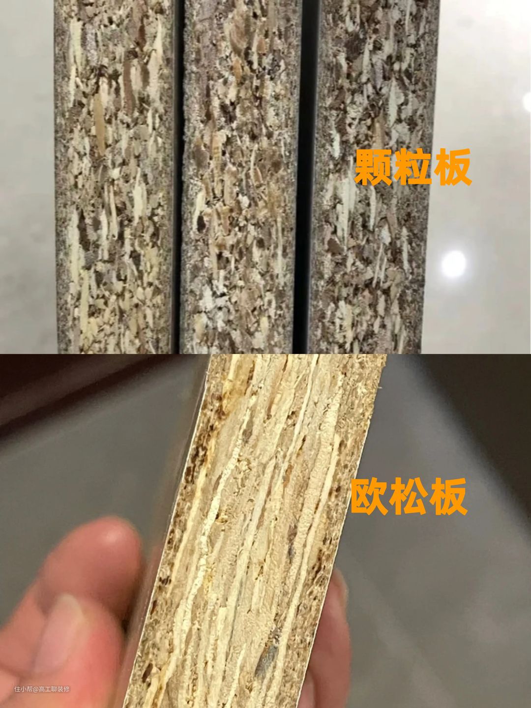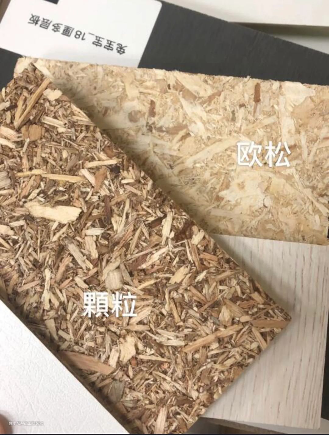 欧松板是选用进口树种单一的松木原木为制作原料;颗粒板用的杂木边角料或者小径木材。