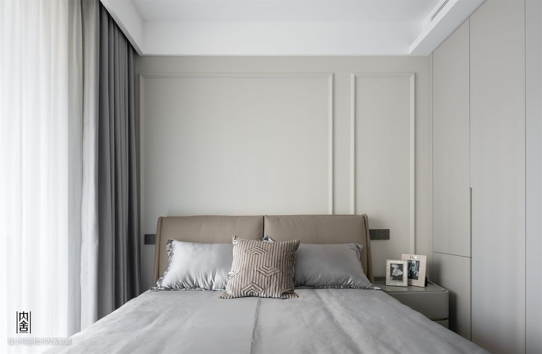 主卧以奶油系色系,整体温柔暖意。床头背景利用pu线条来丰富视觉画面,实现空间的优雅大气。