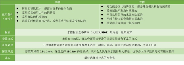 总结:厨房面积小,厨房台面不超过4米选单槽更合适,厨房面积大可以根据自己的习惯和喜好选择双槽和单槽。