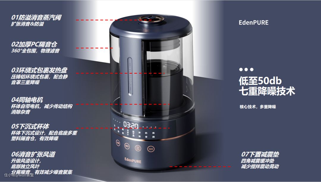 这部分就看商家们八仙过海各显神通了, 各有各的看家本领。大致主要的技术有:消音阀、同轴电机、下沉式杯体、下置减震垫、金属耦合器、减震耦合器、双螺旋共振消音系统、砥柱等等。 原理是减少不必要的摩擦和共振,增加稳定性,降低工作时因为震动而产生的的不必要的杂音。