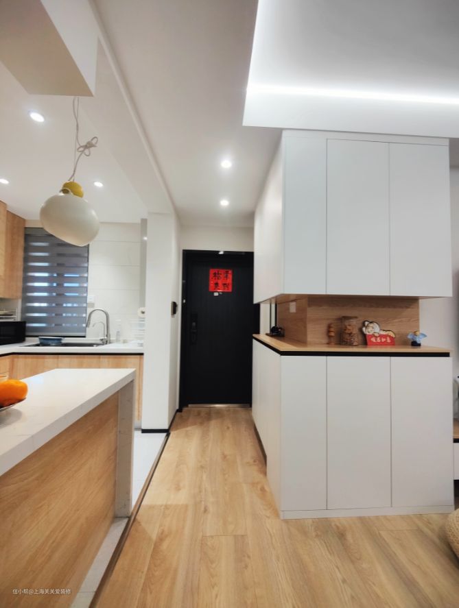 ✔定制玄关柜。如果入户处在不影响走动的情况下,还余有空间,咱们可以贴墙定制玄关柜,具体尺寸根据空间大小来设定,玄关柜做好功能分区,置物区、收纳区、放鞋区等。