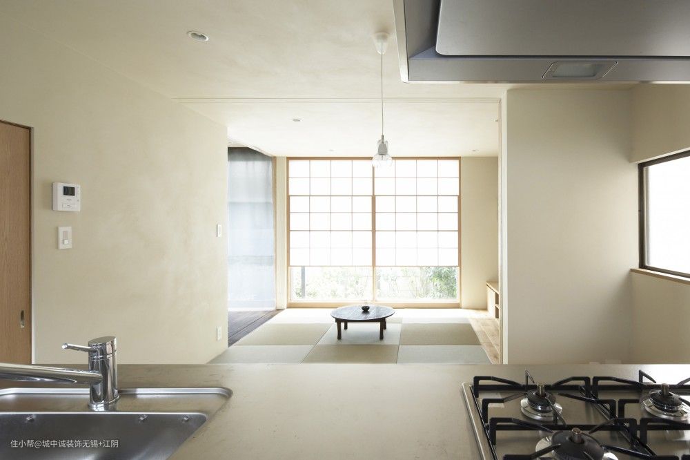 在现代的日式装修中,在镂空的地板放上餐桌的设计。 由于餐桌的一边连接到厨房,因此它的优点是从厨房一侧可以用作工作台。
