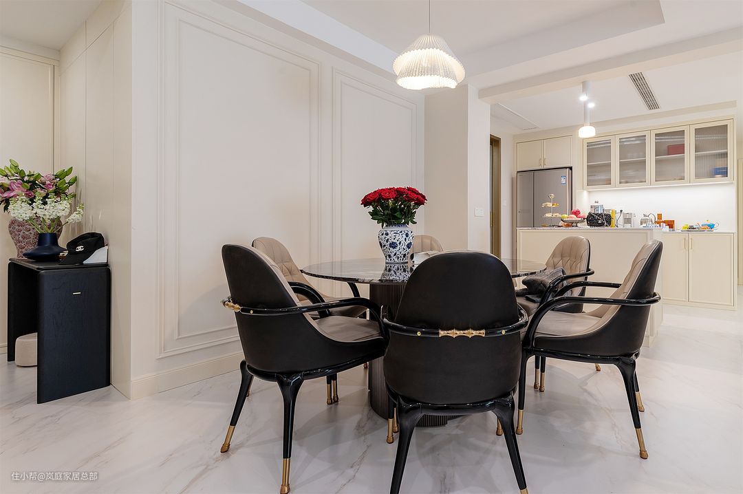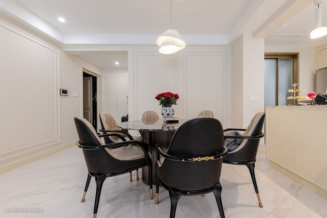 黑色大理石的餐桌台面,自带沉稳大气的质感,加入金属色做点缀,将高贵典雅拿捏得恰到好处。