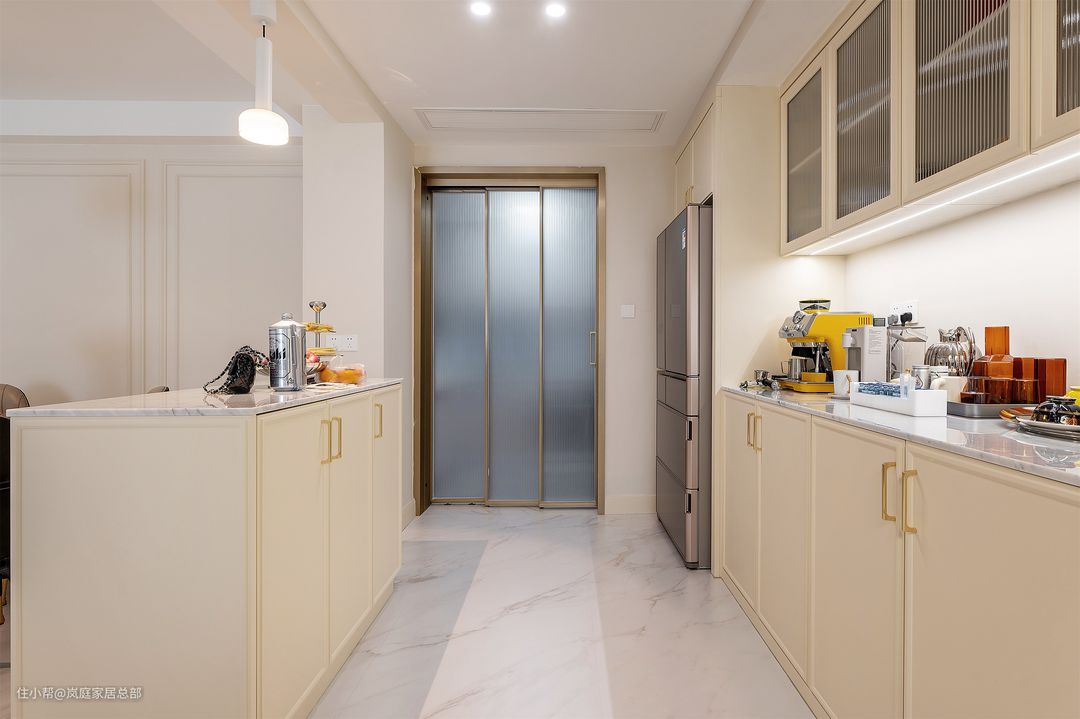岛台两侧都留出了空位,方便进出,也更显宽敞。在靠墙一侧则是做了定制的餐边柜,冰箱挪出嵌入式设计,美观又实用。