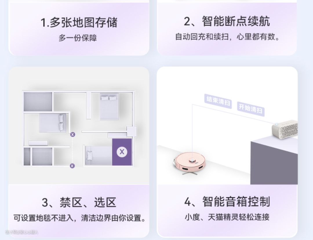 多张地图存贮功能,万一地图不见了也不用再次建模,还能自己设置禁区和选区,我把阳台设置了禁区后,就算阳台门开着以内X3也不会“越雷池”!
