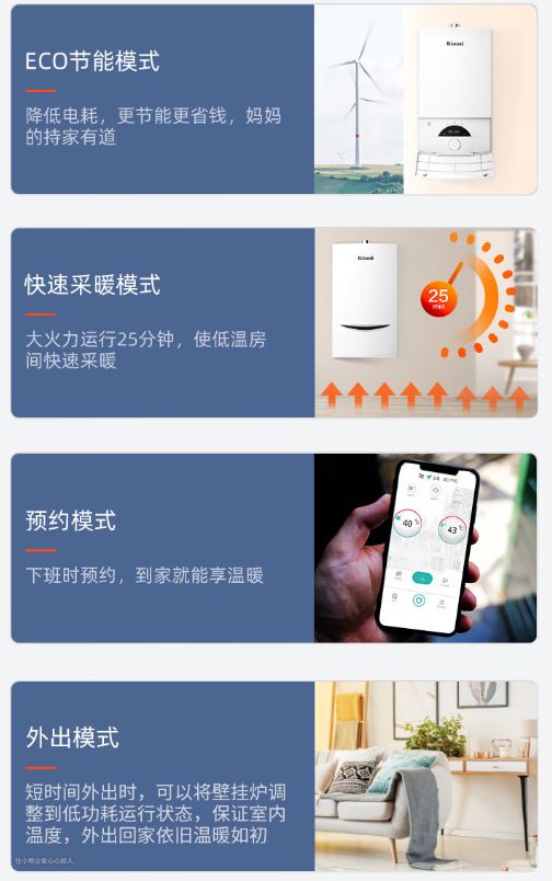 通过WIFI连接手机后,支持多种模式远程操控——ECO节能、快速制暖、预约制暖、外出制暖,ECO节能就类似美的的云管家智慧节能功能,跟空调的ECO模式类似,外出制暖前面讲过就不多说了,原理是一样的;
