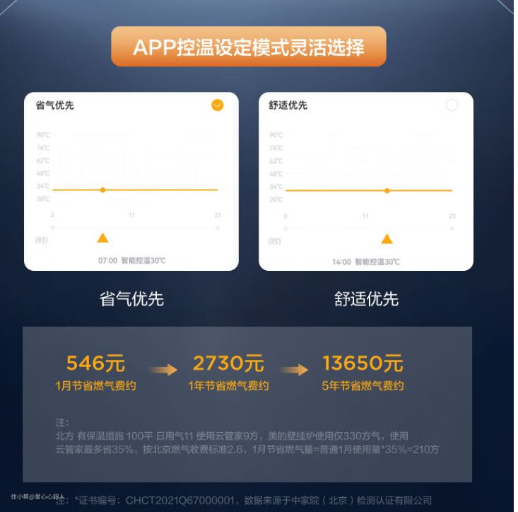 记录完毕后,对应时间前就会自动根据室内外温度调节水温,冬天什么时候用水都是温暖的。如果采暖温度不合适的话还能手动调节,AI管家会再次进行优化,同时还能在APP上设置舒适优先还是省气优先,理论上开启“智慧云管家”功能后,省气效率可达35.6%