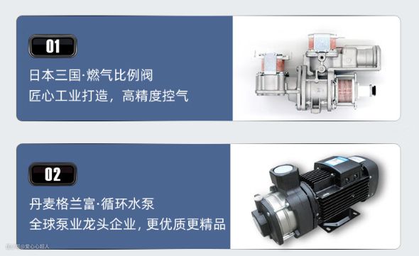 核心硬件水泵、气阀来自于世界各地的优秀品牌(燃气比例阀来自日本三国,水泵来自于荷兰格兰富),质量有保证;