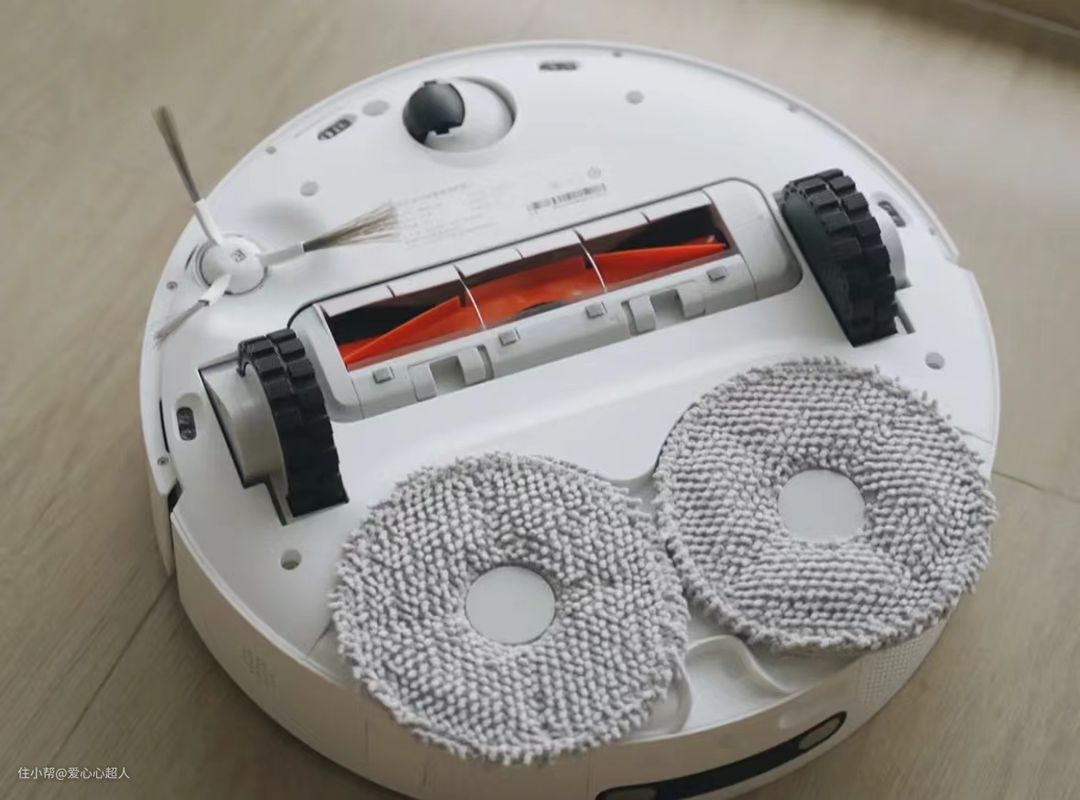其他清洁配置上,同样是胶毛一体主刷和两个边刷,拖地部分拖布要比机器人的本体稍微宽一些,美中不足拖布比较薄一些,同样是旋转加压的方式进行清理。